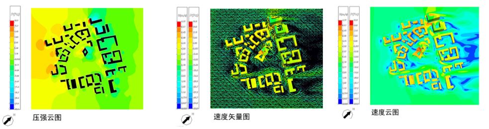 在夏季以及过渡季节主导风向下,场地内人行高度主要活动区域通风流畅,周围没有形成较大的涡流区域,场地内人活动区内没有无风区,满足标准要求,满足“50%以上可开启外窗室内外表面的风压差大于0.5Pa”有利于自然通风的利用以改善室内热环境。
